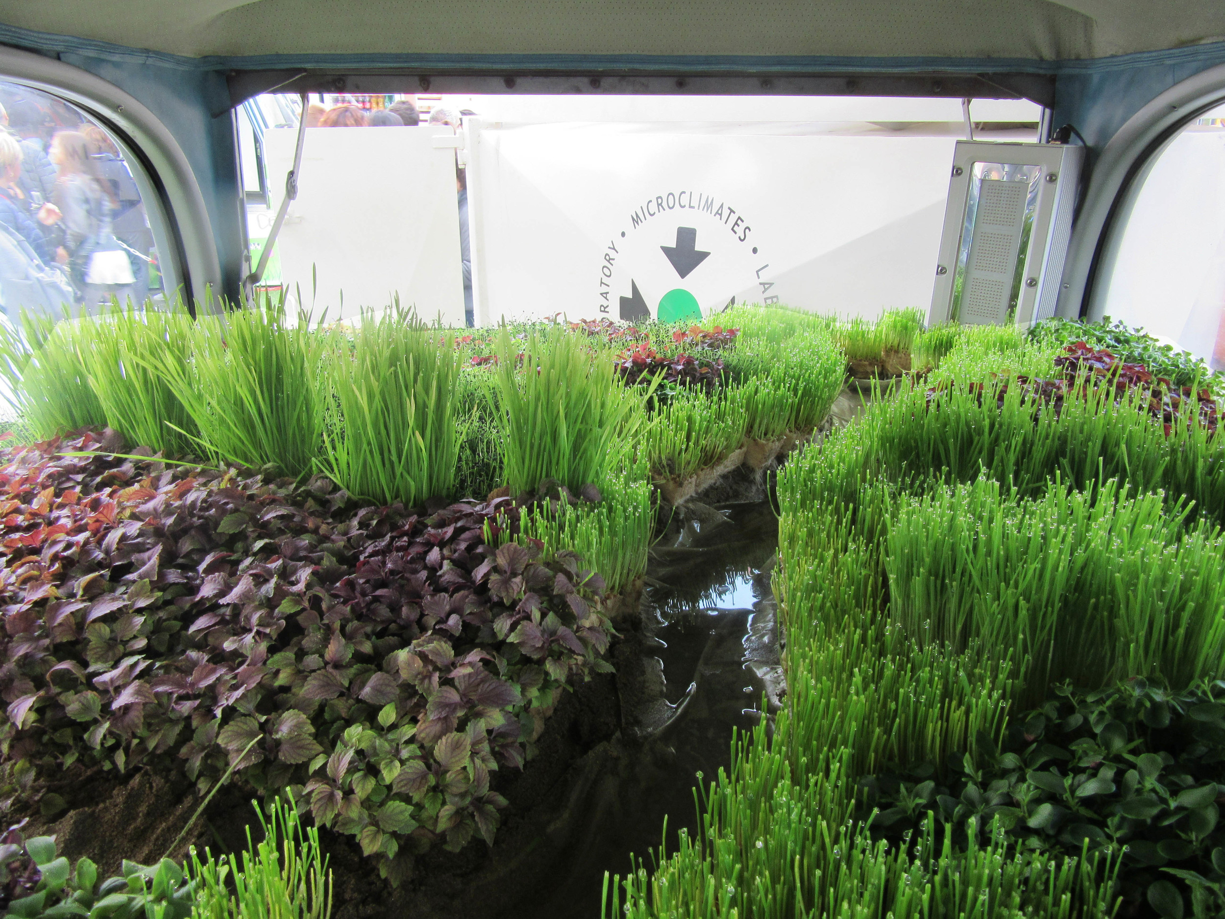 Binnen de laboratorium Jeep was het 'Good Food Landscape' te zien met een aangepast LED-verlichting systeem (Lemnis Oreon) en een micro-landschap met kruiden- en kiemgroenten (Koppert Cress).