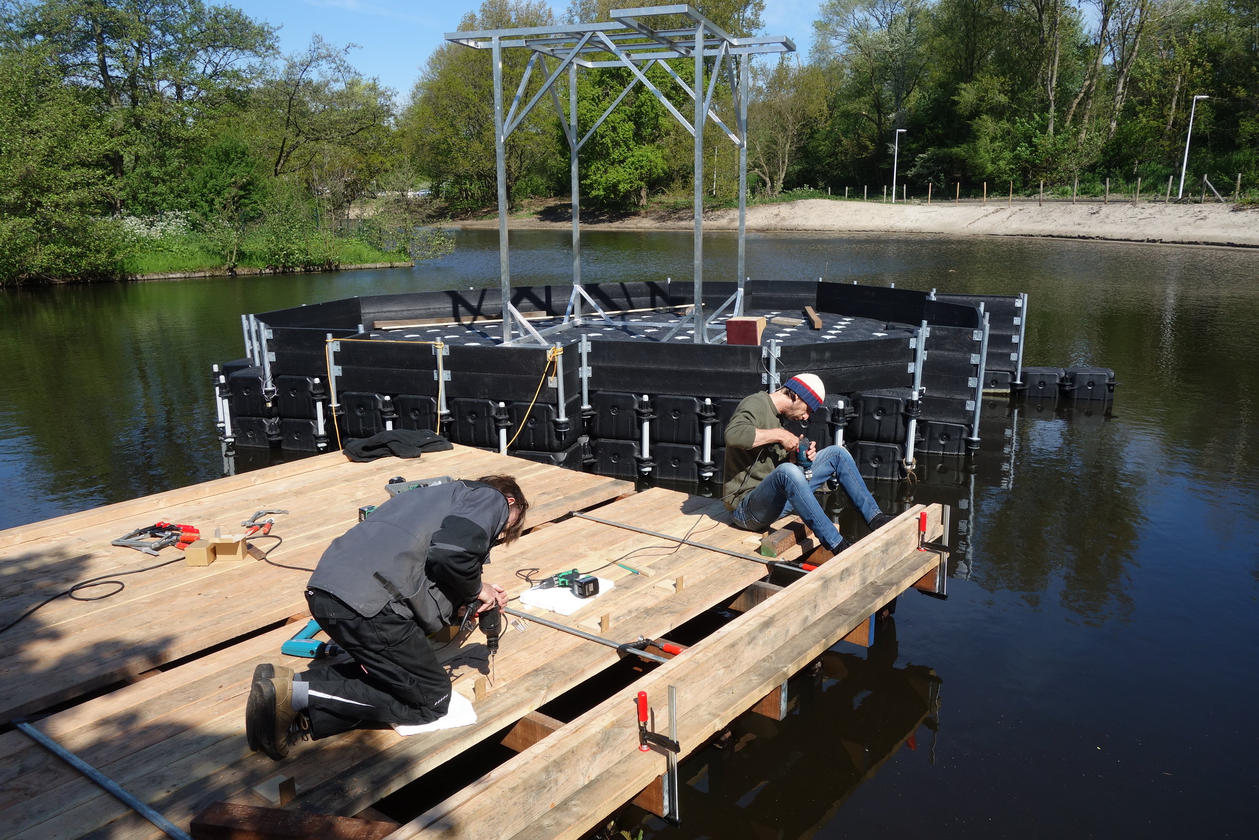 Het eiland van 7x6 meter kan voor werkzaamheden naar de aanlegsteiger getrokken worden om door leerlingen bezocht of verzorgd te worden.